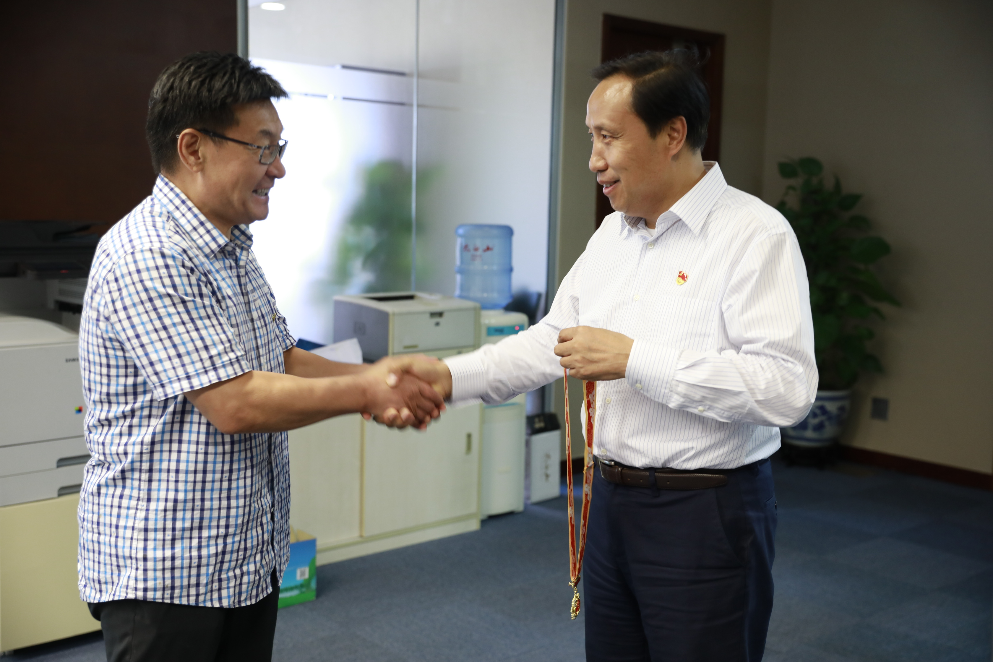 新中国成立以来,京能集团印伟民、刘荣、张兴文、马植胜、田凤林、崔淑敏、黄祖旺七人获全国劳模称号。近日,京能集团工会在集团党委副书记、工会主席李迅的带领下,走进其中六位退休劳模家中,将“庆祝中华人民共和国成立70周年”纪念章和鲜花送到劳模手里,并同劳模们亲切握手交谈,仔细询问他们的身体和家庭情况。