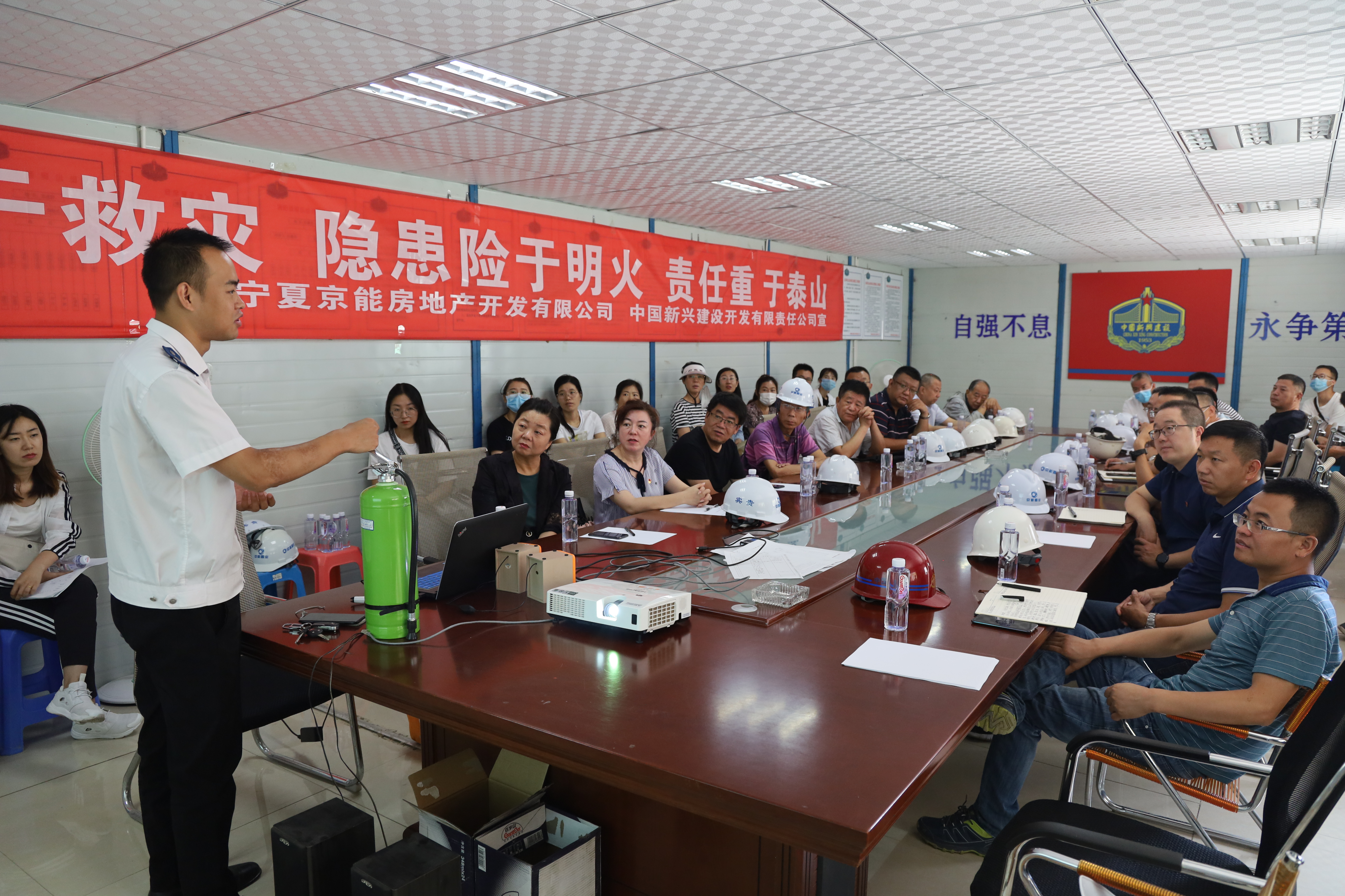 为进一步增强消防安全意识,提升应急自救能力,筑牢建筑工地消防安全底线,8月10日上午,宁夏京能房地产开发有限公司与银川市质监站联合开展消防安全培训及消防演练活动。本次培训特邀安全健康教育网李博教官主讲,中国新兴建设开发责任有限公司、建研凯勃建设工程咨询有限公司等总包、监理单位参加了活动。